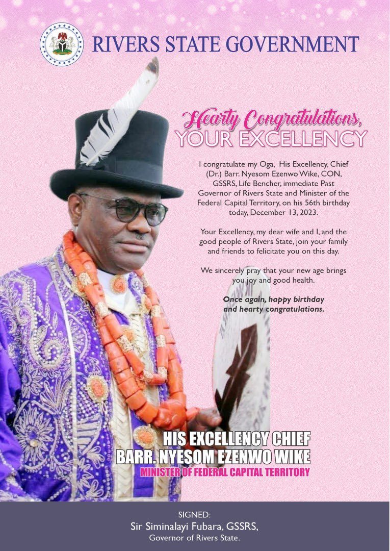 I congratulate my Oga, His Excellency, Chief (Dr) Barr. Nyesome Ezenwo Wike, CON, GSSRS, Life Bencher, Immediate Past Governor of Rivers State and Minister of the Federal Capital Territory, on his 56th birthday today, December 13, 2023.