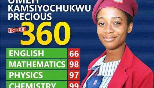 Miss Nkechinyere Umeh, the candidate with the best score in the 2023 Unified Tertiary Matriculation Examinations (UTME), has been given a scholarship by Anambra State Governor Charles Soludo.