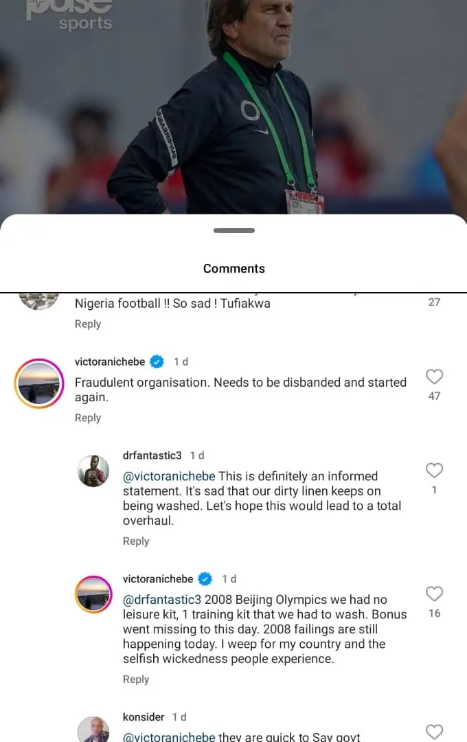 He had in an earlier comment called for the NFF to be disbanded and restarted. While responding to someone who shared his sentiments, Anichebe wrote: