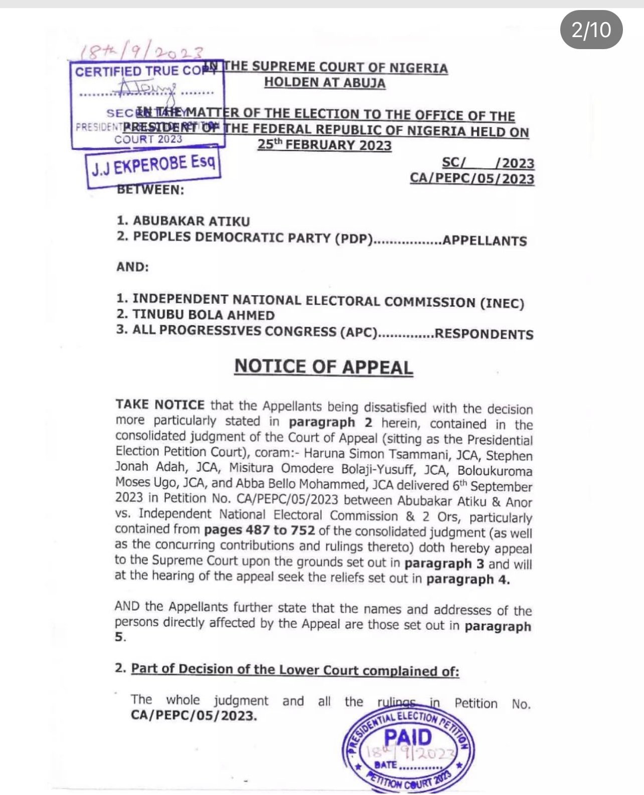 The Peoples Democratic Party’s presidential candidate, Alhaji Abubakar Atiku, has petitioned the Supreme Court to overturn the decision of the Presidential Election Petition Court, which upheld Bola Ahmed Tinubu’s declaration as the winner of the 2023 presidential election on September 6.