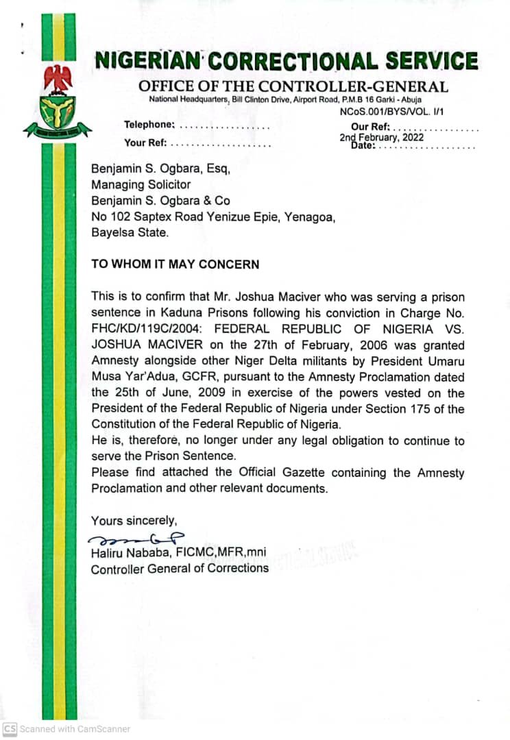 Haliru Nababa, in response to a request made by the Managing Solicitor of the Benjamin S. Ogbara & Co., Benjamin Ogbara Esq, on the status of Joshua Maciver’s prison sentence, stated that while he was remanded and serving a prison sentence in the Kaduna Prison following a conviction in the charge number FHC/KD/19c/2004, Joshua Maciver and other Niger Delta militants were granted am