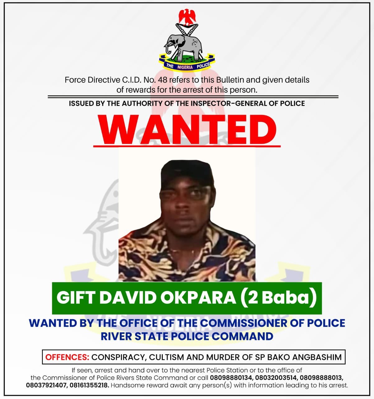 “The Nigeria Police Force has declared one Gift David Opara aka (2baba) wanted for the below offences, 101 million naira bounty has been placed on him by the Rivers State Gov and The NPF.
