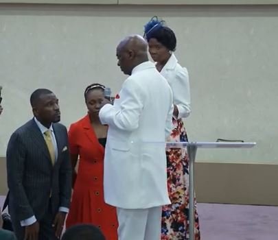 In the YouTube video, his father, Bishop David Oyedepo, not only ministered but also prayed for Isaac and his wife, Ayomitide, who were both kneeling.