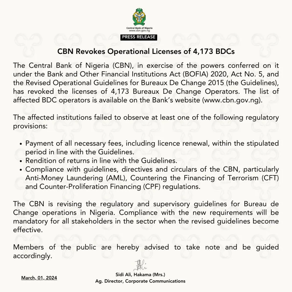 The Central Bank of Nigeria (CBN) has revoked the licenses of 4,173 Bureaux de Change Operators.