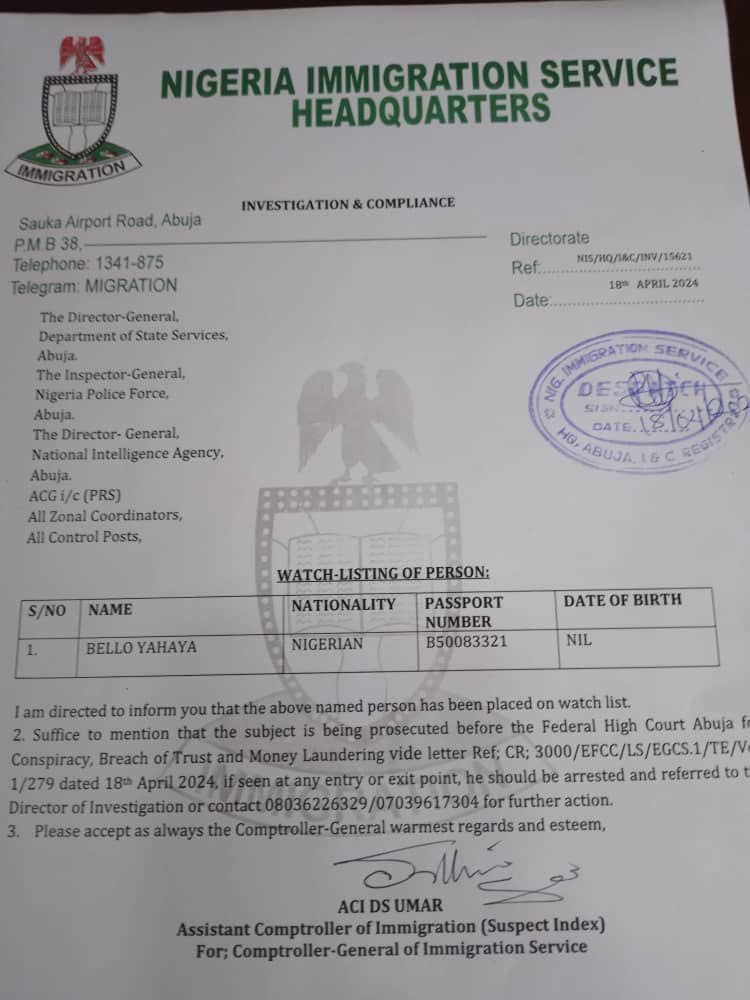 “Suffice to mention that the subject is being prosecuted before the Federal High Court Abuja for Conspiracy, Breach of Trust and Money Laundering vide letter Ref; CR; 3000/EFCC/LS/EGCS.1/TE/V1/279 dated 18 April 2024. If seen at any entry or exit point, he should be arrested and referred to the Director of Investigation or contact 08036226329/07039617304 for further action.