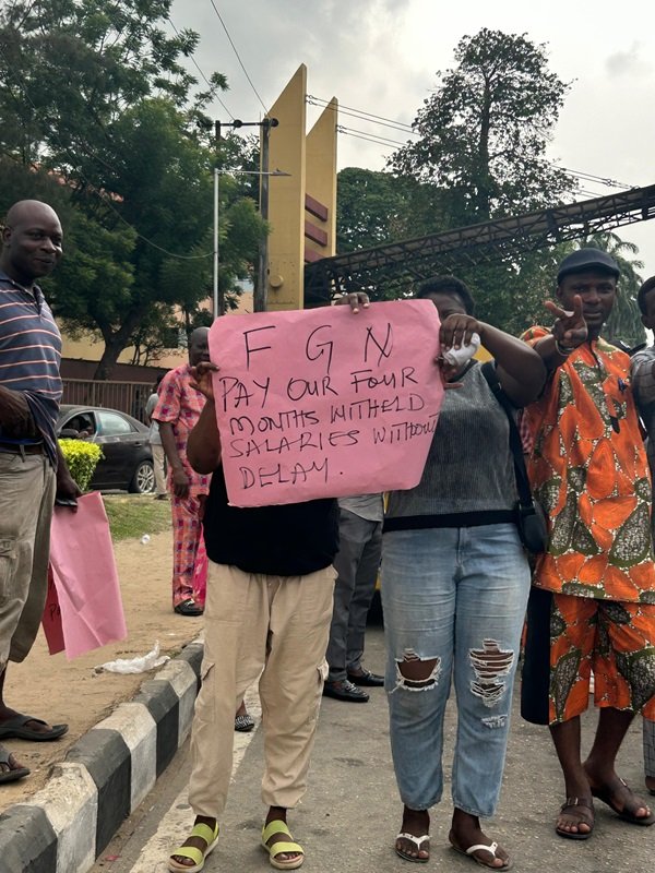 Other placards had inscriptions: “FGN pay our four months’ salaries without delay!’’ and “Pay us our 4 months salaries!’’