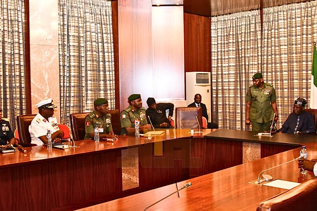 The Chief of Defence Staff, General Christopher Musa, the Chief of Army Staff, Lieutenant General Taoreed Lagbaja, the Chief of Navy, Admiral Emmanuel Ogalla, and the Chief of Air Staff, Air Marshal Hassan Abubakar, were present at the usual meeting at the Presidential Villa.