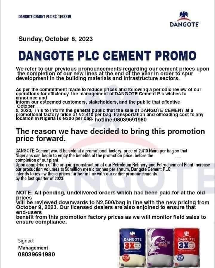 “NOTE: all pending, undelivered orders which had been paid for at the old prices will be reviewed downward to N2,600/bag in line with the new pricing from October 9, 2023. Our licensed dealers are also enjoined to ensure that end-users benefit from this reduction in the factory”