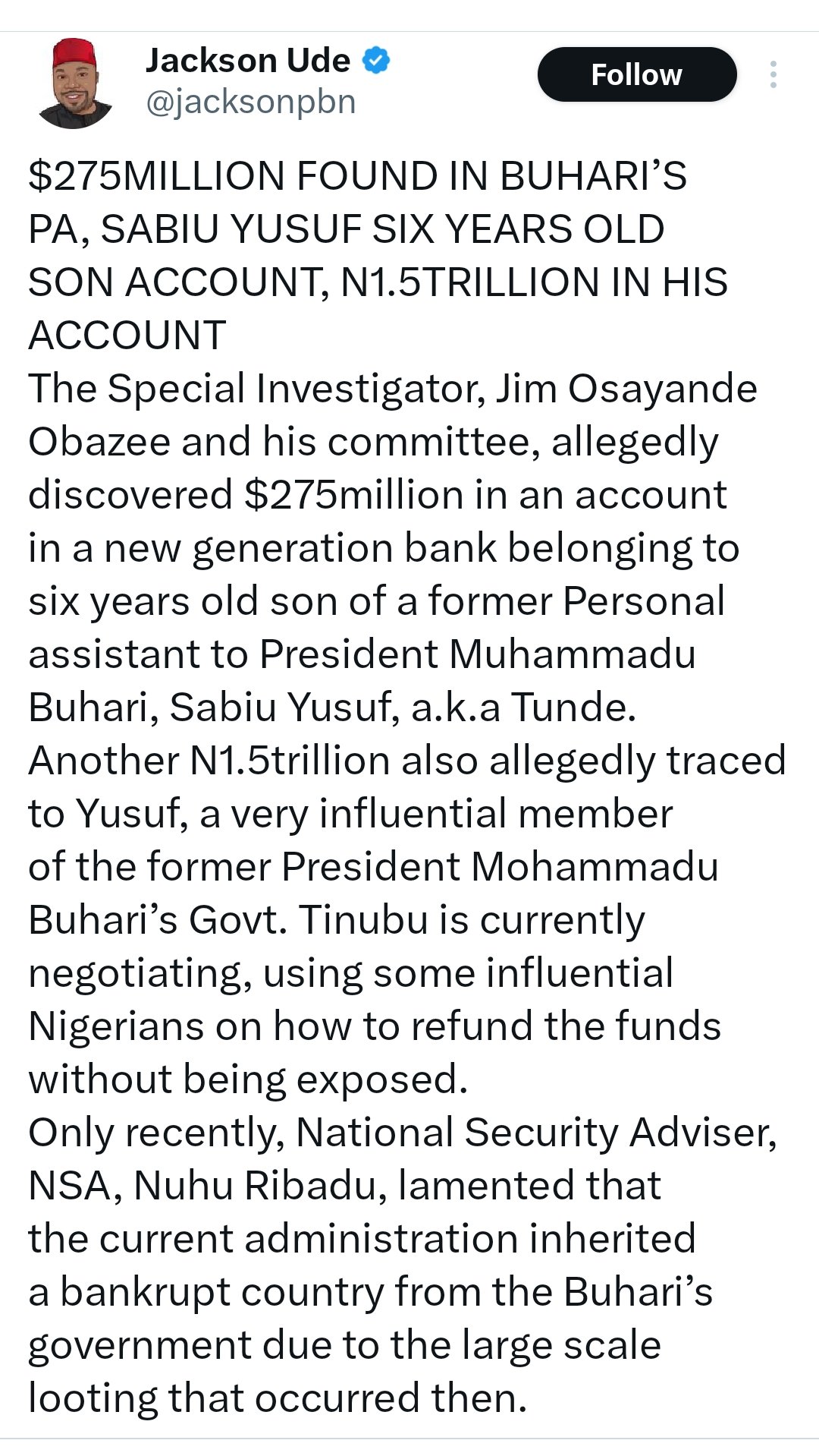 According to an X user Jackson Ude, the Special Investigator, Jim Osayande Obazee, and his committee allegedly uncovered $275 million in an account in a new generation bank belonging to Sabiu Yusuf, a.k.a Tunde, the six-year-old son of a former Personal Assistant to President Muhammadu Buhari.