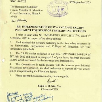 However, in a circular dated September 21, 2023, issued by the Auditor General of the Federation to Polytechnics and Colleges of Education, the Auditor General stated that the implementation was approved by the Presidential Committee on Salaries at its 13th meeting.