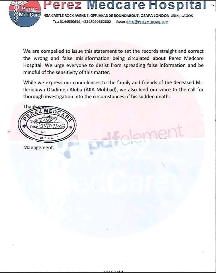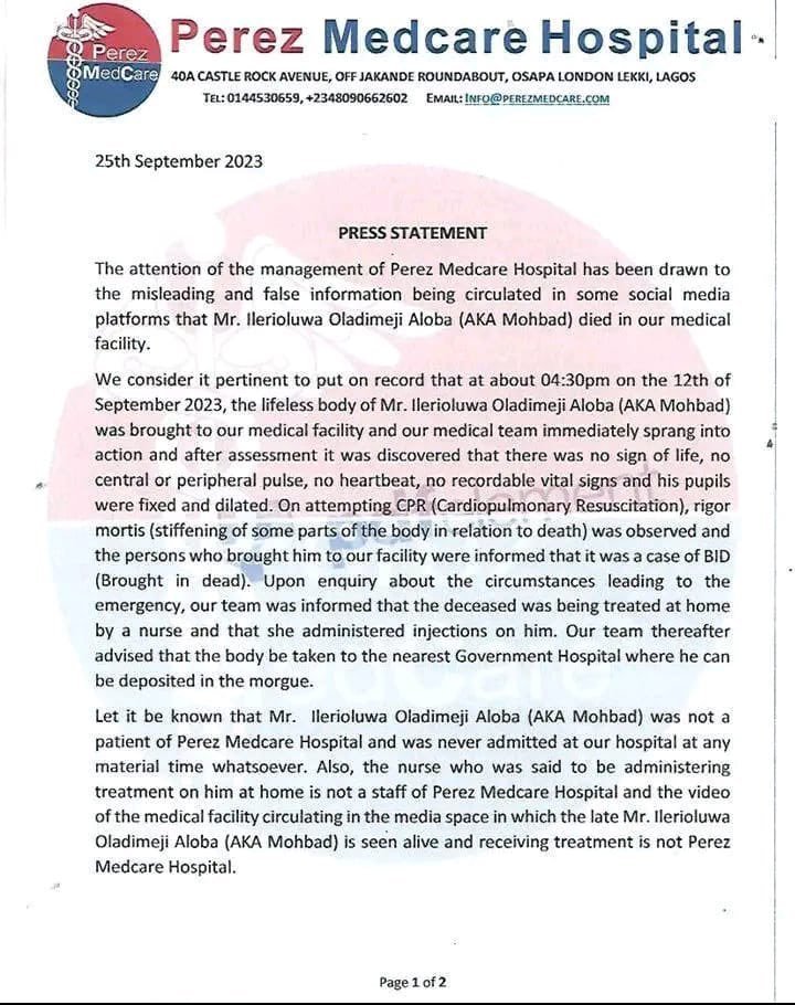 “The attention of the management of Perez Medcare Hospital has been drawn to the misleading and false information being circulated in some social media platforms that Mr. Ilerioluwa Oladimeji Aloba (AKA Mohbad) died in our medical facility.