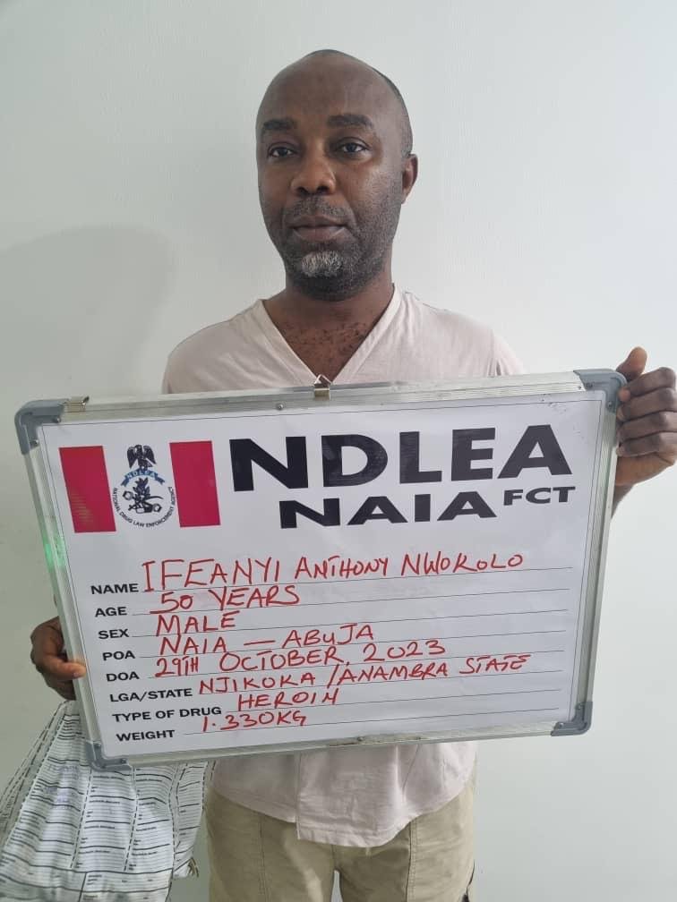 Meanwhile, NDLEA said its operatives on Sunday, 29th October, intercepted yet another businessman, 50-year-old Nwokolo Ifeanyi Anthony, at the Nnamdi Azikiwe International Airport, NAIA, Abuja, during the outward clearance of Air France flight AF 878 to Amsterdam, Netherlands, via Paris, France, at the boarding gate and was body scanned, with the result turned out to be positive for illicit drug ingestion.