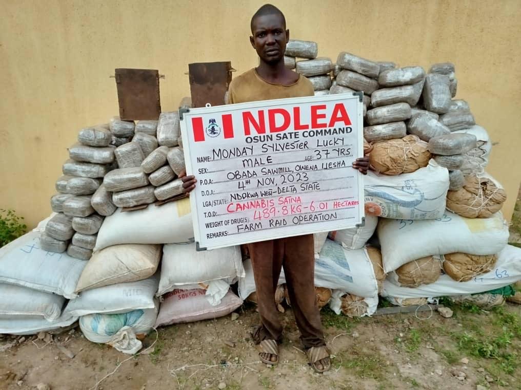 “While operatives in Osun on Saturday 4th November stormed the Obada sawmill forest in Owena-Ijesa, Oriade LGA where they arrested a suspect, Monday Sylvester, 37, on a 6.01 hectares of cannabis farm which was destroyed and 489.8kgs already processed plant recovered, their colleagues in Edo raided a trans-loading point inside Avbiosi forest, Owan West LGA where 603 kilograms of the illicit substance were seized.