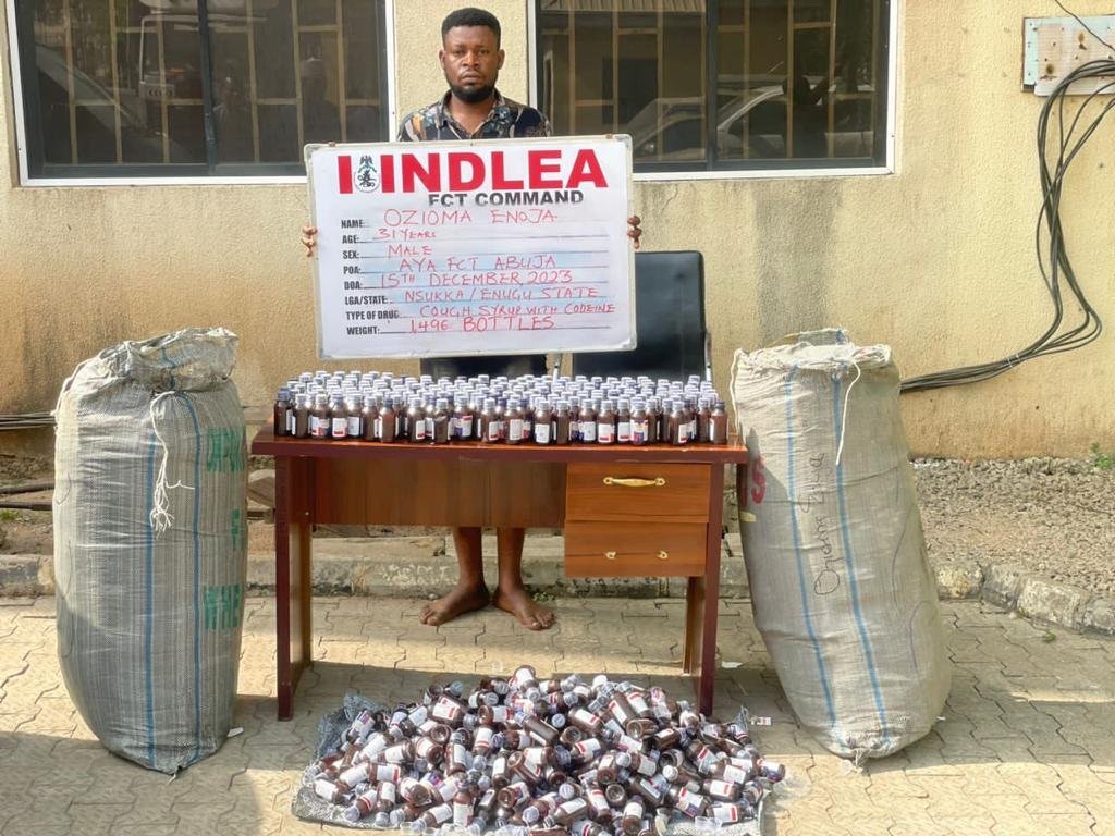 “At the Federal Capital Territory, FCT Abuja, operatives on Friday 15th December intercepted a consignment of 1, 496 bottles of codeine syrup at A.Y.A area of the city while a suspect, Ozioma Enoja, 31, was arrested in a follow up operation. Another consignment of 400 bottles of the same opioid coming from Port Harcourt, Rivers state was also seized along Abaji-Abuja highway on Saturday 16th December after which a suspect, Bala Ishaq was arrested during a follow up operation at Zuba motor park.