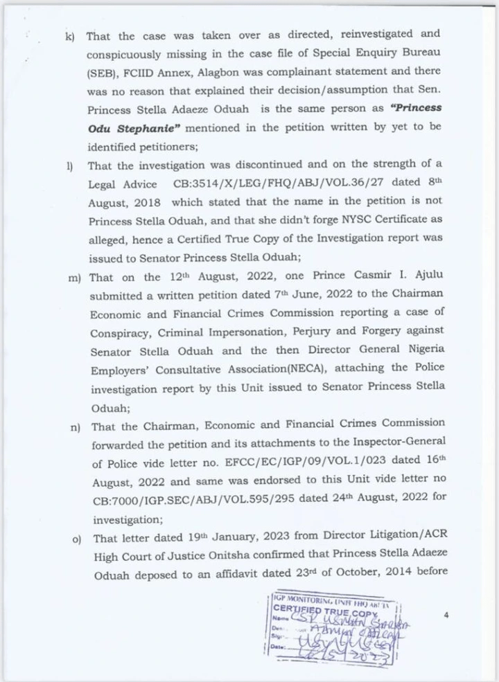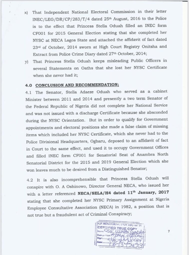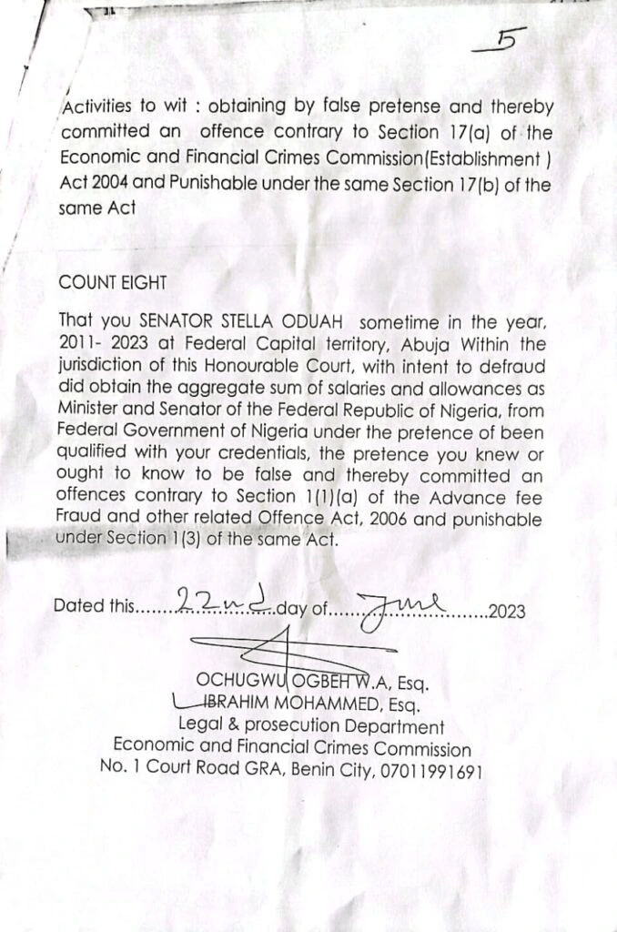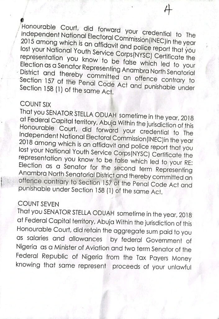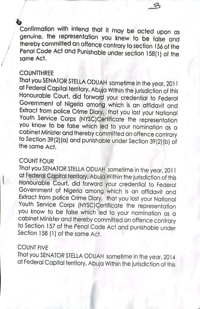 One of the other counts reads, “That you SENATOR STELLA ODUAH sometime in the year, 2011 at Federal Capital Territory, Abuja ithin the jurisdiction of this Honourable Court, did forward your credential to Federal Government of Nigeria among which is an affidavit and Extract from police Crime Diary, that you lost your National Youth Service Corps (NYSC) Certificate the representation you know to be false which led to your nomination as a cabinet Minister and thereby committed an offence contrary to Section 157 of the Penal Code Act and punishable under Section 158 (1) of the same Act.”