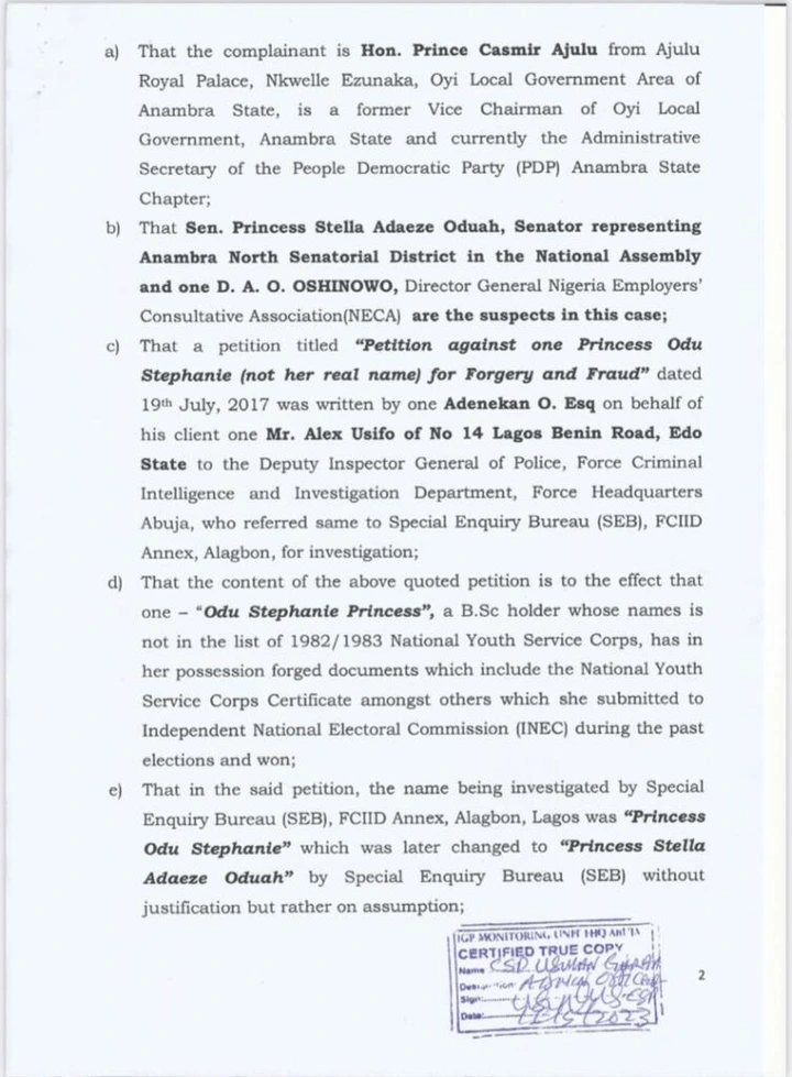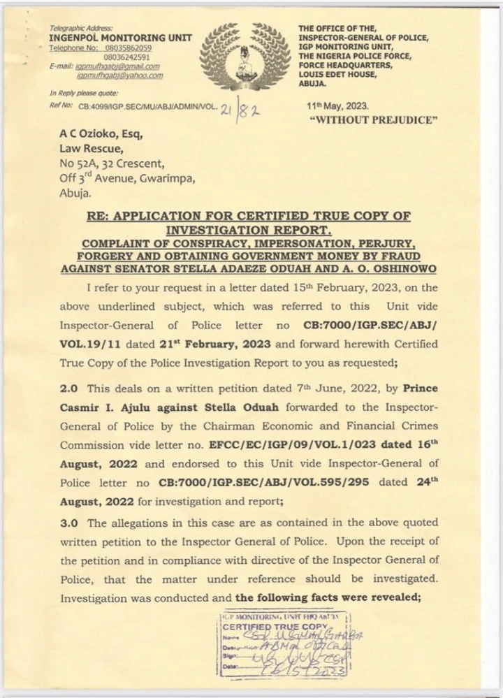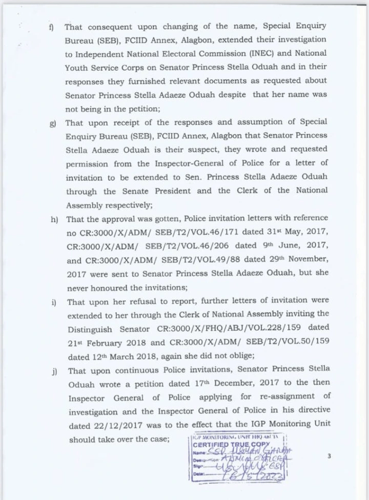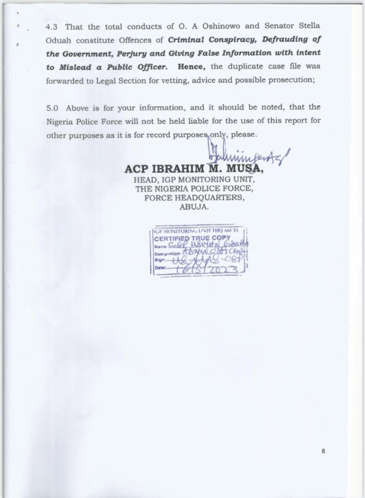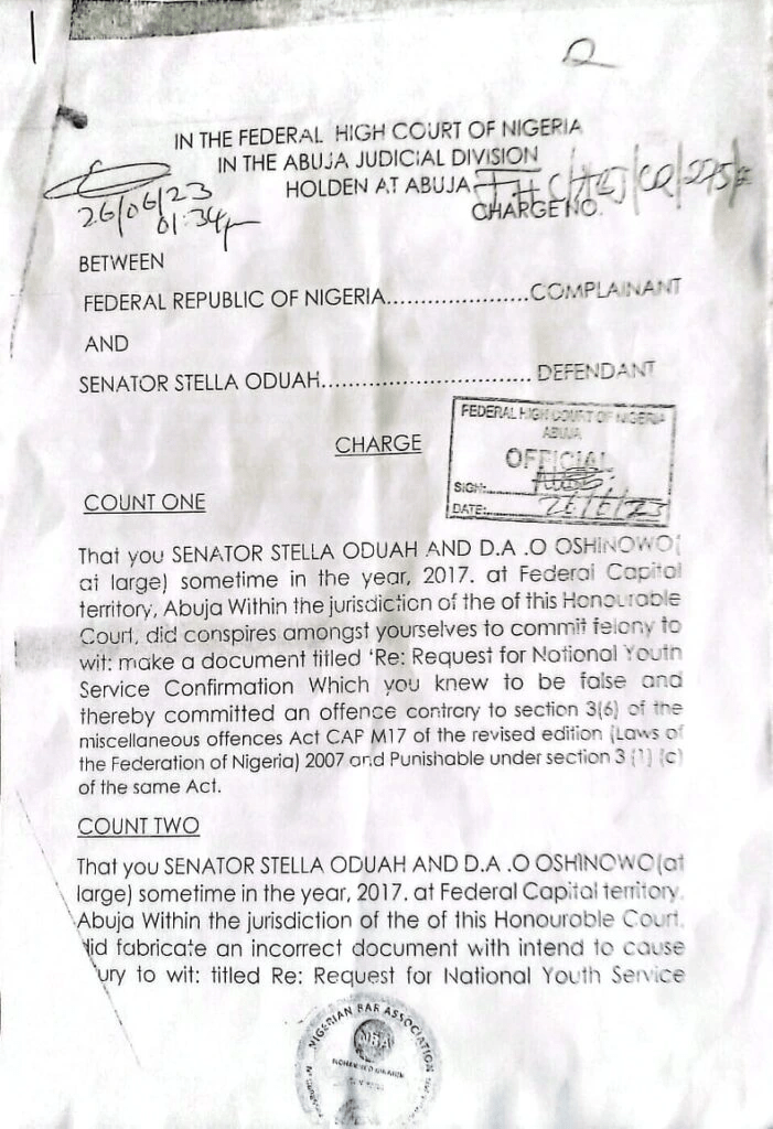 One of the counts read, “That you SENATOR STELLA ODUAH AND D.A.O OSHINOWO (at large) sometime in the year, 2017, at Federal Capital Territory, Abuja. Within the jurisdiction of this Honourable Court, did conspires amongst yourselves to commit felony to wit: make a document titled ‘Re: Request for National Youth Service Confirmation Which you knew to be false and thereby committed an offence contrary to section 3(6) of the miscellaneous offences Act CAF M17 of the revised edition (Laws of the Federation of Nigeria) 2007 and Punishable under section 3 (1) (c) of the same Act.”