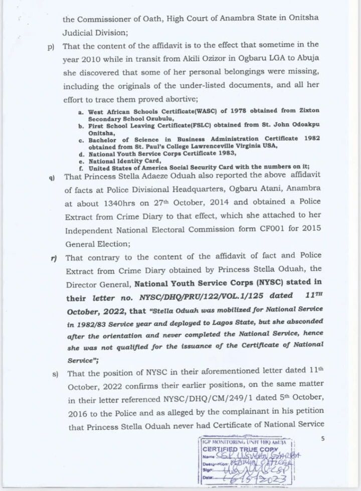 In the originating summons, Emeka prayed the court to declare that the information supplied by Oduah in her INEC Form CF001, with respect to her participation in the National Youth Service Corps (NYSC) scheme, was false.