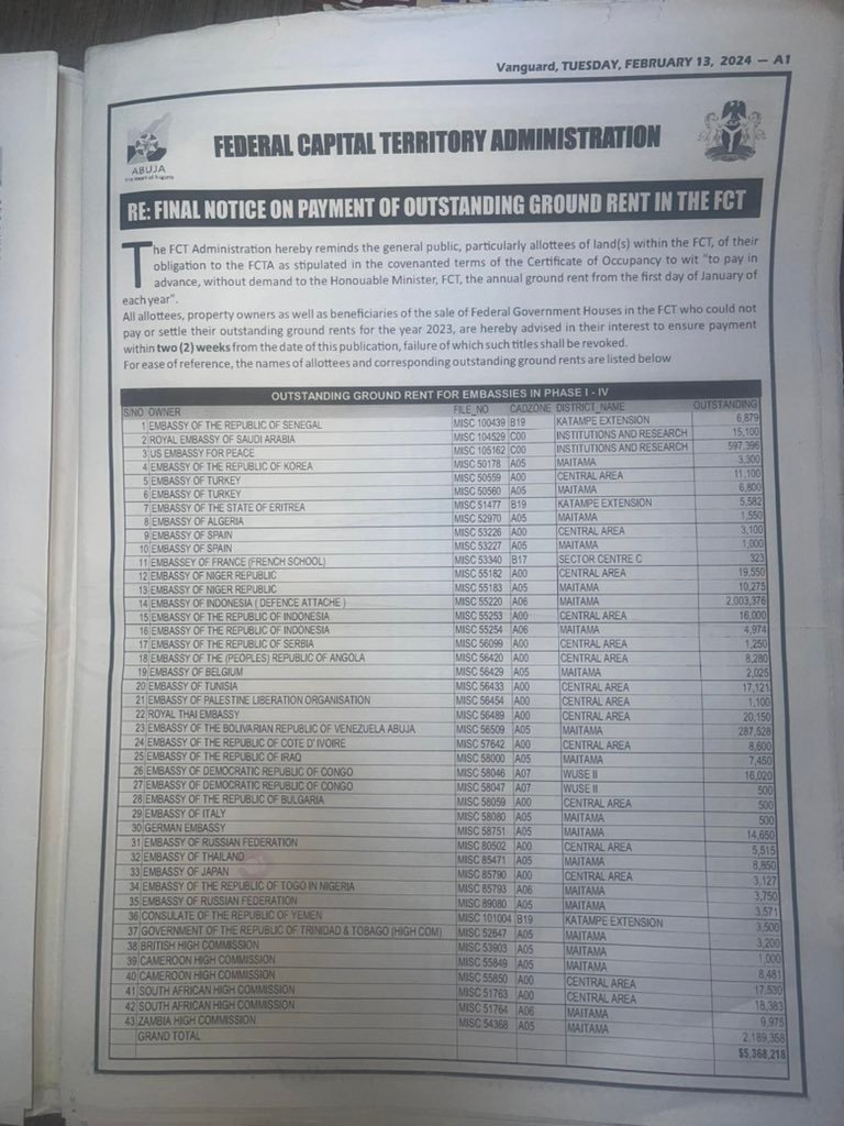 In a document headed Final Notice on Payment of Outstanding Ground Rent in the FCT, the impacted organisations were given only two weeks to pay up.